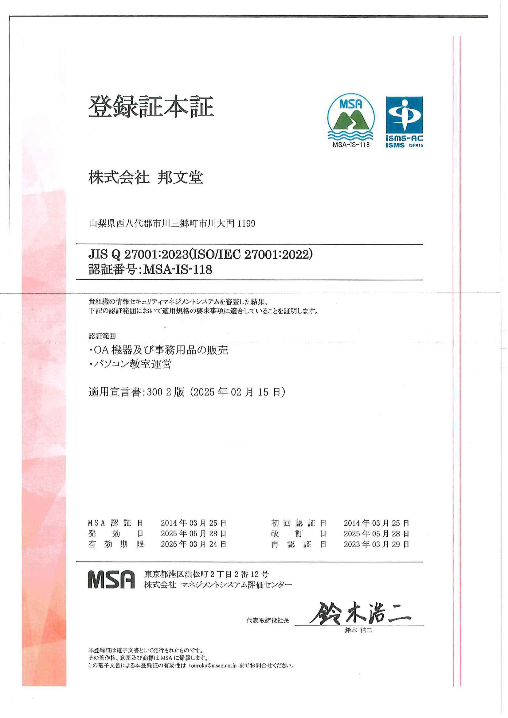 | ㈱ 邦文堂は、OA機器・事務用品・パソコン教室事業を営む企業として、お客様からお預かりした 情報資産を含む当社が保有する情報資産を守ることが社会的な責務と考え、ここに情報セキュリティ 基本方針を定め、実践することを宣言します。 |