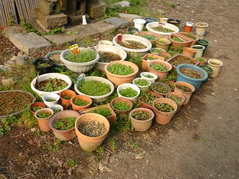 いらなくなった鉢を持ち寄って種を蒔きました。